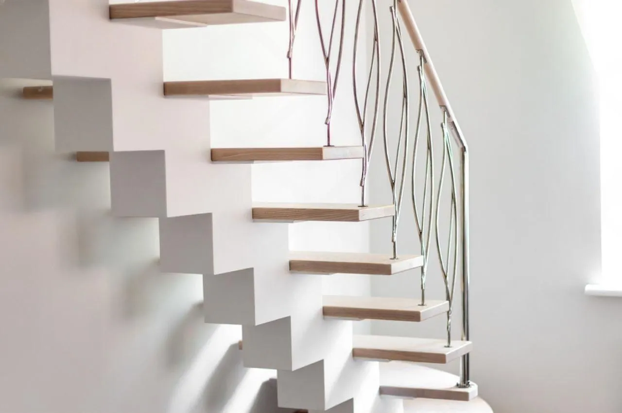 Основа композиции — белоснежный бетонный монокосоур, который служит невидимой несущей осью и словно растворяется в пространстве. На нем, будто паря в воздухе, расположены ступени из натурального бука, которые привносят в интерьер тепло и природную текстуру. Особый шарм конструкции придает комбинированное ограждение: тактильно приятный деревянный поручень плавно переходит в лаконичные металлические основания, а тонкие фигурные стержни балясин с хромовым покрытием ловят блики света, добавляя динамики.